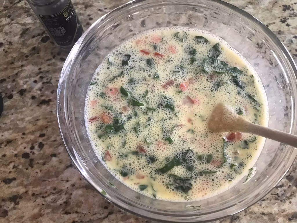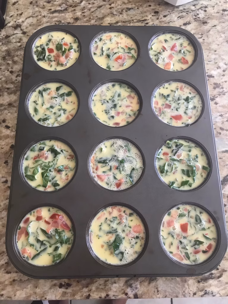 - Pour the egg mixture onto the muffin pan filling ¾ of the way