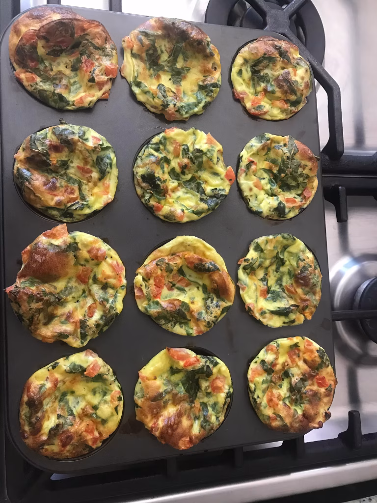 - In a separate bowl; mix the other ingredients then add the mixture onto the muffin pan. Alternatively fry the ingredients for 2 min first, then add to the muffin pan.